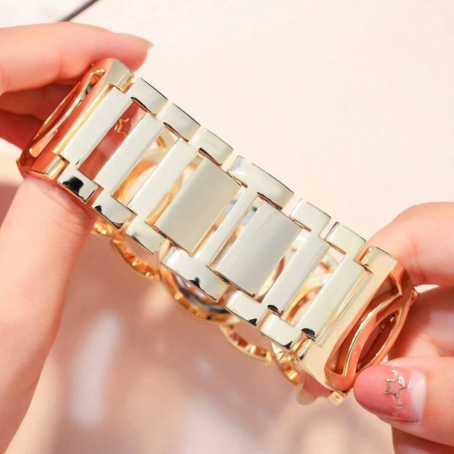 استمتعي بإطلالة فاخرة مع هذه الساعة النسائية المصممة بأناقة عصرية ومكونات عالية الجودة. الإطار الذهبي اللامع مع التصميم الفريد يضفي لمسة من الرقي على معصمك في كل مناسبة.