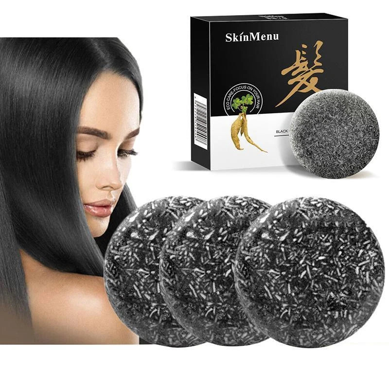 استعيدي لمعان شعرك وصحته مع صابون العناية بالشعر SkinMenu Black Shine المصنوع من مكونات طبيعية 100٪، يعزز صحة فروة الرأس ويمنع ظهور القشرة والشيب المبكر.